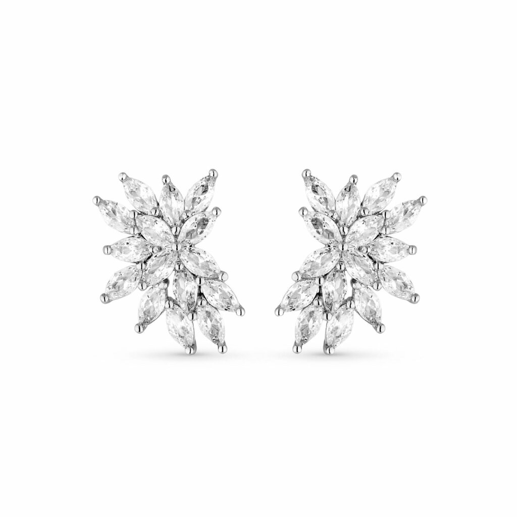 Brinco em formato de folha folheado a ródio branco, com pedras de zircônia em lapidação navete que proporcionam um brilho intenso e sofisticado. O design delicado e simétrico valoriza o contorno do rosto, sendo a escolha perfeita para noivas que desejam uma peça elegante, atemporal e cheia de luminosidade.